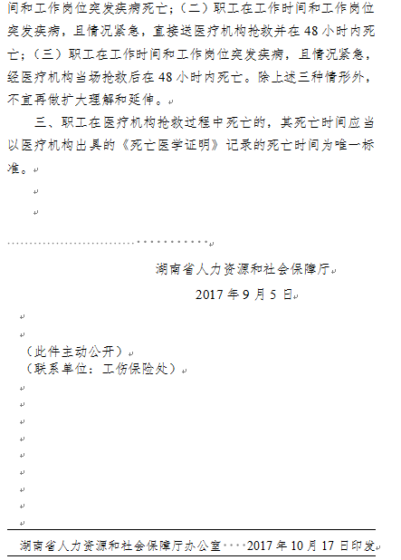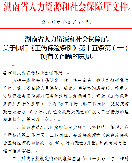 工伤保险条例》第十五条第(一)项规定,“在工作时间和工作岗位,突发疾病死亡或者在48小时之内经抢救无效死亡的”视同工伤。为进一步做好工伤认定工作,统一全省工伤认定情形掌握尺度,经与省高级人民法院、省政府法制办沟通衔接,根据人力资源社会保障部对国务院法制办复函意见,近日,湖南省人社厅就该条款视同工伤情形的理解与执行提出相关意见。